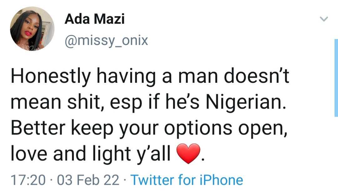 She further said: “Honestly having a man doesn’t mean shit, esp if he’s Nigerian. Better keep your options open, love and light y’all.”