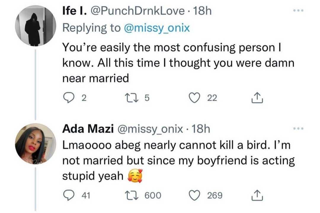 In response she said: ” Nearly cannot kill a bird. I’m not married but since my boyfriend is acting stupid yeah.”