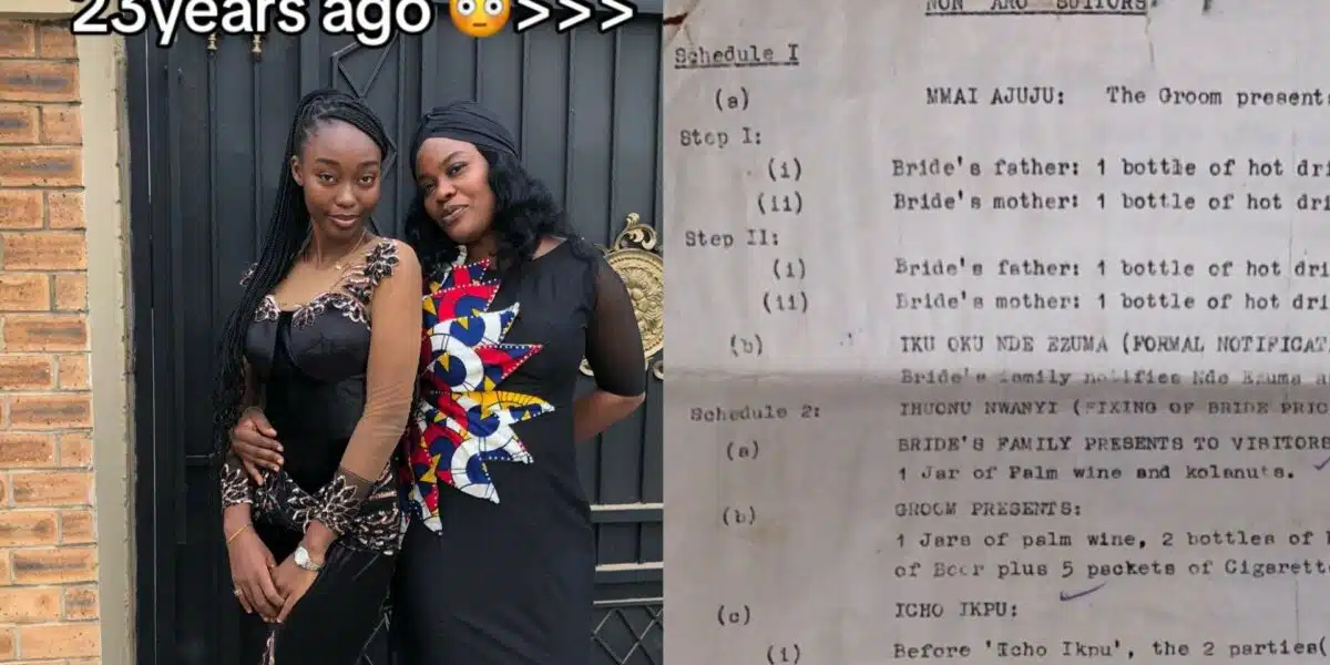 A lady stirs surprise as she shares photos of her mom’s bride price list from 23 years ago, showing the astonishingly low costs of items from that time.