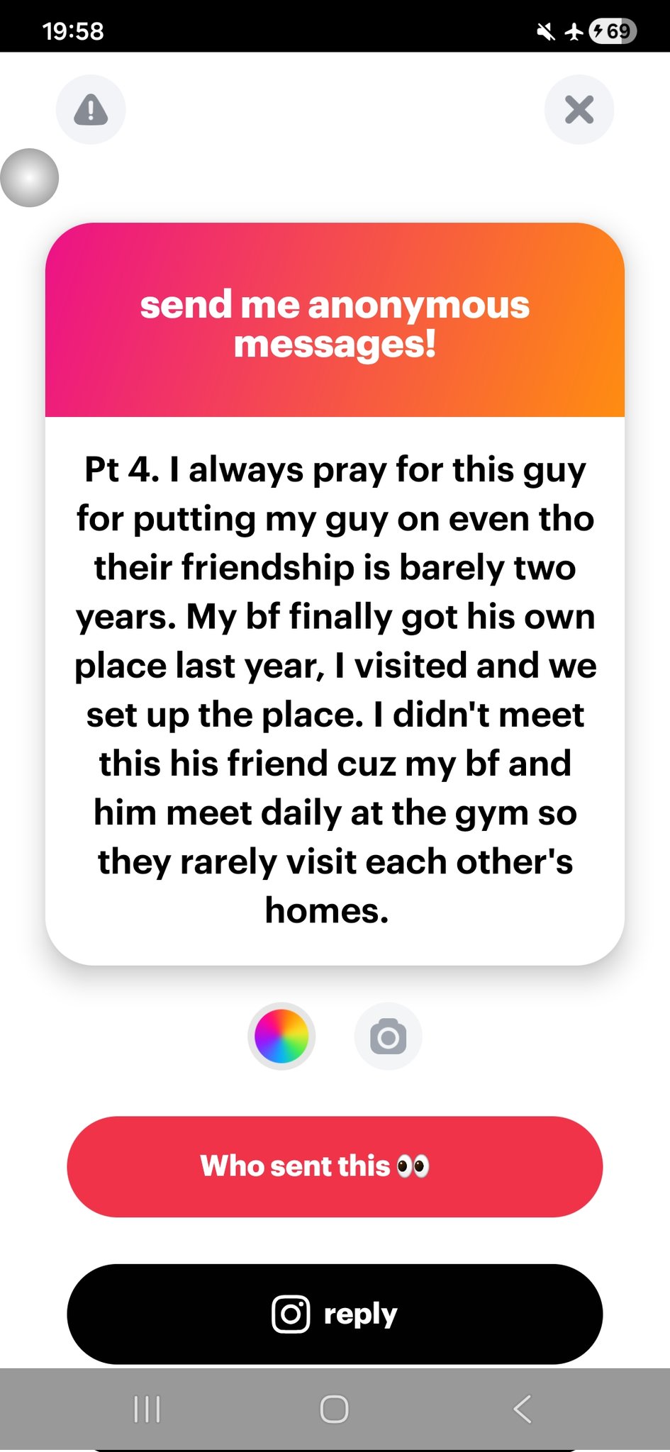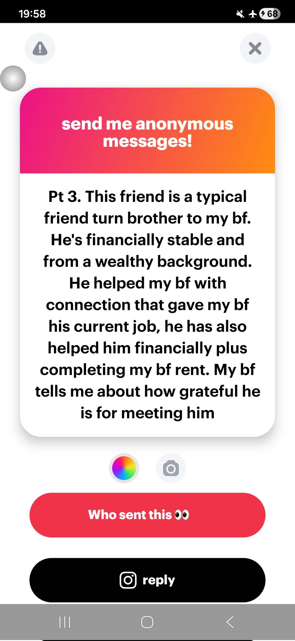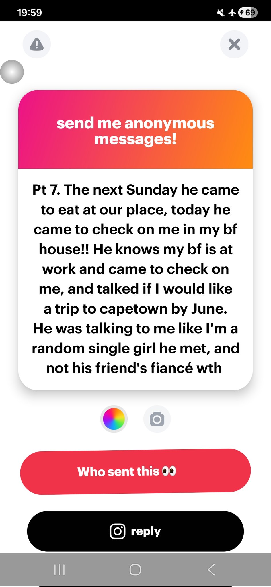 The next Sunday he came to eat at our place, today he came to check on me in my bf house!! He knows my bf is at work and came to check on me, and talked if I would like a trip to capetown by June. He was talking to me like I’ma random single girl he met, and not his friend’s fiancée wth