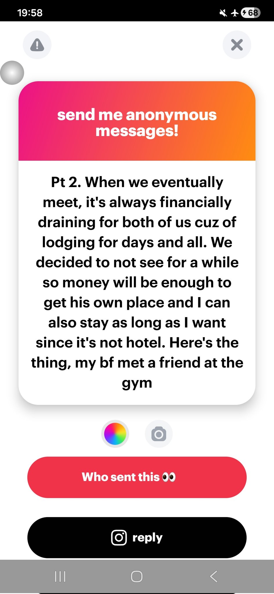 When we eventually meet, it’s always financially draining for both of us cuz of lodging for days and all. We decided to not see for a while SO money will be enough to get his own place and I can also stay as long as I want since it’s not hotel. Here’s the thing, my bf meta friend at the gym