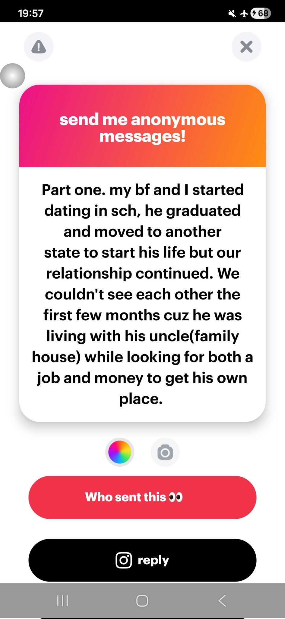 “My bf and I started dating in sch, he graduated and moved to another state to start his life but our relationship continued. We couldn’t see each other the first few months cuz he was living with his uncle(family house) while looking for both a job and money to get his own place.