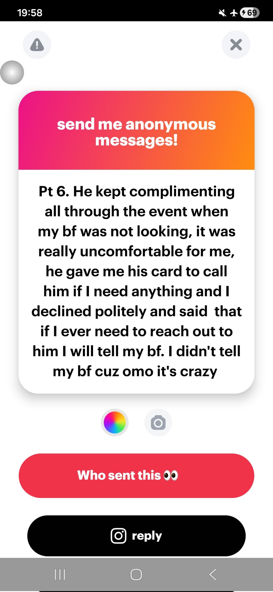 He kept complimenting all through the event when my bf was not looking, it was really uncomfortable for me, he gave me his card to call him if I need anything and I declined politely and said that if I ever need to reach out to him I will tell my bf. I didn’t tell my bf cuz omo it’s cr@zy