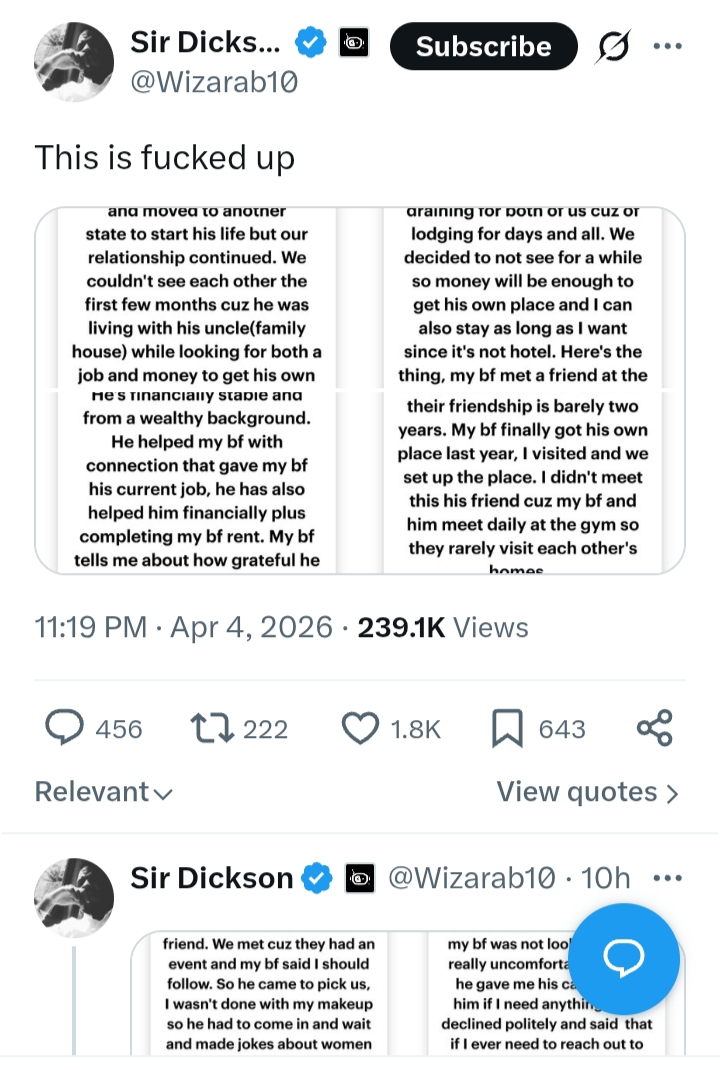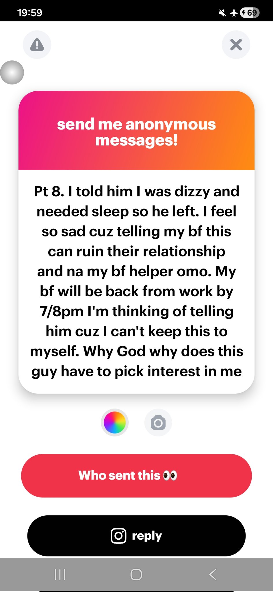 I told him I was dizzy and needed sleep so he left. I feel so sad cuz telling my bf this can ruin their relationship and na my bf helper omo. My bf will be back from work by 7/8pm I’m thinking of telling him cuz I can’t keep this to myself. Why God why does this guy have to pick interest in me