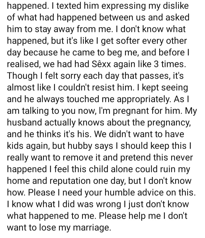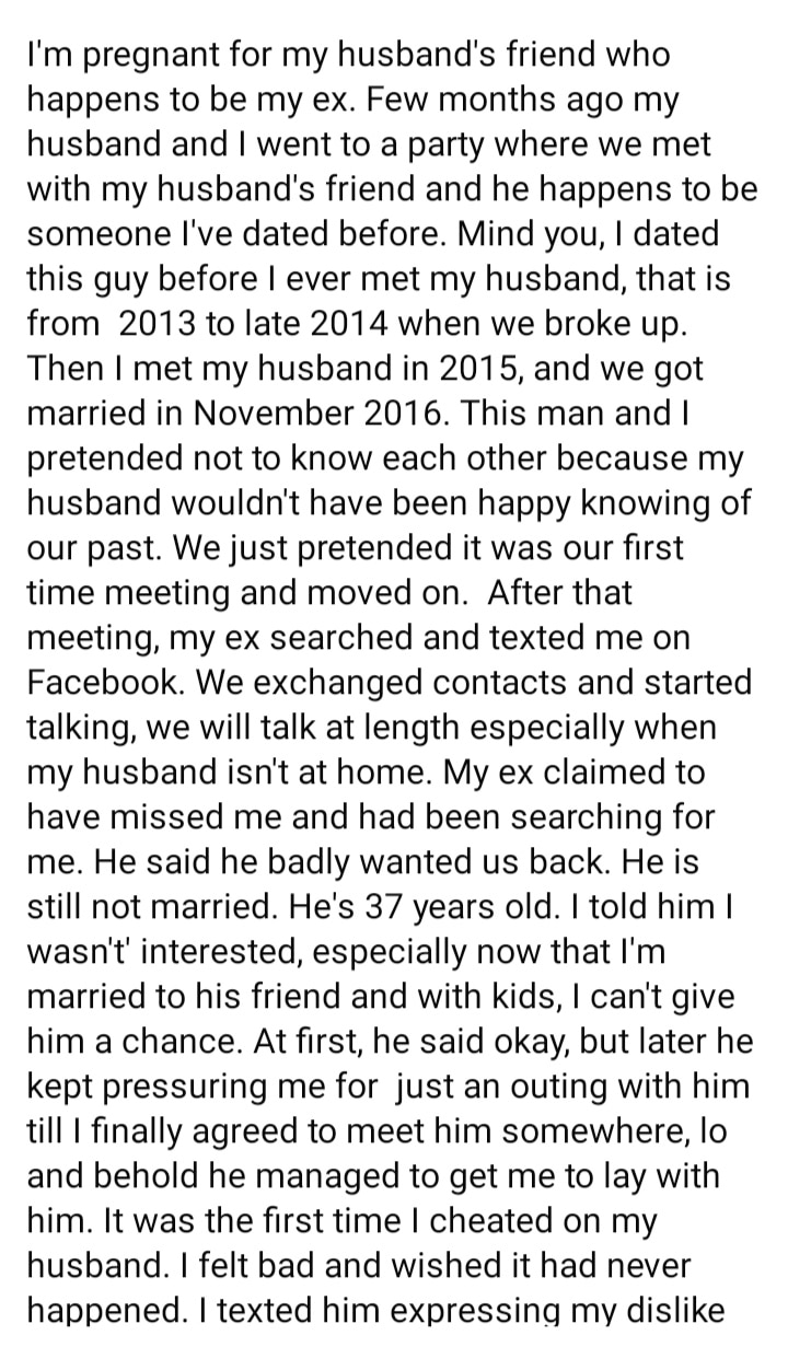 “I’m pregnant for my husband’s friend who happens to be my ex. Few months ago my husband and I went to a party where we met with my husband’s friend and he happens to be someone I’ve dated before. Mind you, I dated this guy before I ever met my husband, that is from 2013 to late 2014 when we broke up. Then I met my husband in 2015, and we got married in November 2016. This man and I pretended not to know each other because my husband wouldn’t have been happy knowing of our past. We just pretended it was our first time meeting and moved on. After that meeting, my ex searched and texted me on Facebook. We exchanged contacts and started talking, we will talk at length especially when my husband isn’t at home. My ex claimed to have missed me and had been searching for me. He said he badly wanted us back. He is still not married. He’s 37 years old. I told him I wasn’t’ interested, especially now that I’m married to his friend and with kids, I can’t give him a chance. At first, he said okay, but later he kept pressuring me for just an outing with him till I finally agreed to meet him somewhere, lo and behold he managed to get me to lay with him. It was the first time I cheated on my husband. I felt bad and wished it had never happened. I texted him expressing my dislike of what had happened between us and asked him to stay away from me. I don’t know what happened, but it’s like I get softer every other day because he came to beg me, and before I realised, we had had Sêxx again like 3 times. Though I felt sorry each day that passes, it’s almost like I couldn’t resist him. I kept seeing and he always touched me appropriately. As I am talking to you now, l’m pregnant for him. My husband actually knows about the pregnancy, and he thinks it’s his. We didn’t want to have kids again, but hubby says I should keep this I really want to remove it and pretend this never happened I feel this child alone could ruin my home and reputation one day, but I don’t know how. Please I need your humble advice on this. I know what I did was wrong I just don’t know what happened to me. Please help me I don’t want to lose my marriage.”