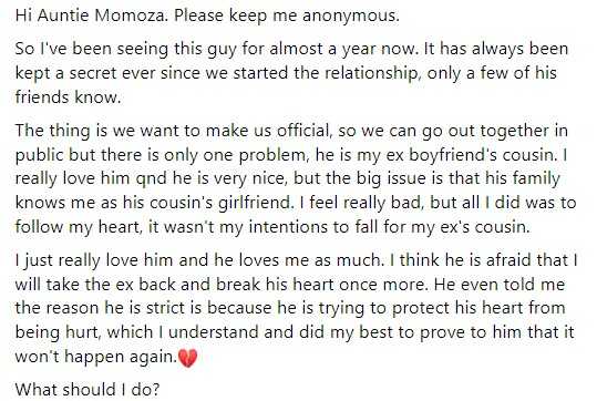 Lady in love with ex-boyfriend’s cousin seeks advice on how to make relationship public