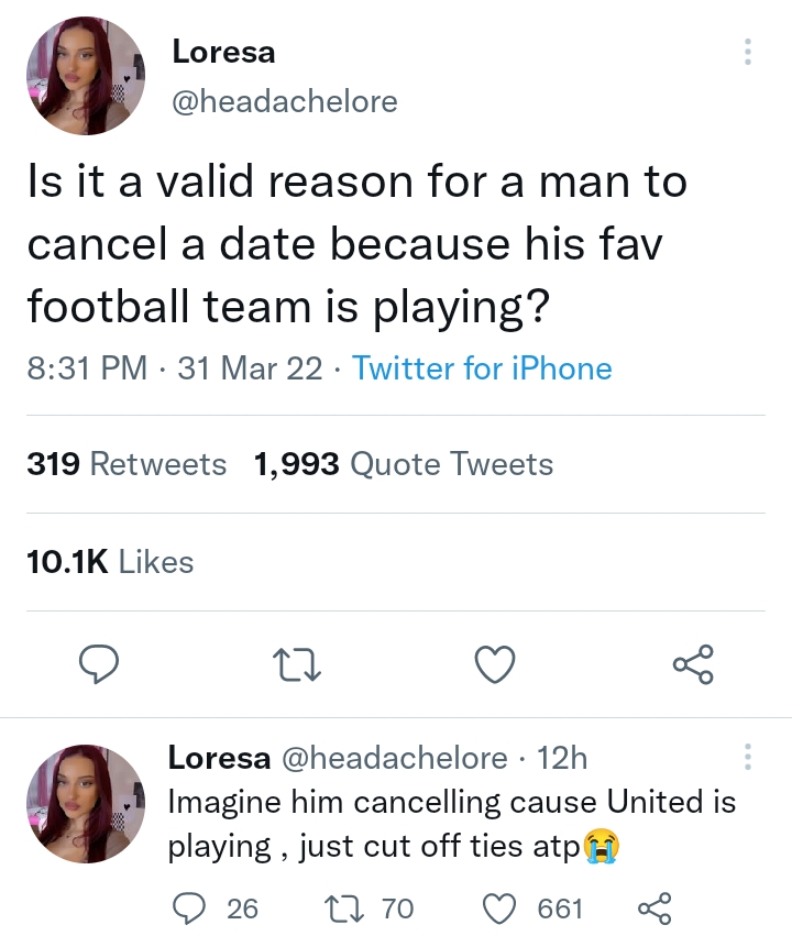 The lady who expressed her unhappiness over the issue rushed to the microblogging platform, Twitter to query netizens if it’s right for a man to cancel a date because his favorite football team, Manchester united, will be playing same day with their date.