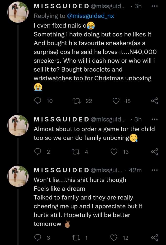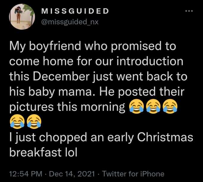 Narrating her ordeal on the micro-blogging platform, Twitter, a young lady with the user name @misguided_nx revealed that her boyfriend who promised to come to her house for their wedding introduction this month of December, has had a second thought and gone back to his Baby mama.