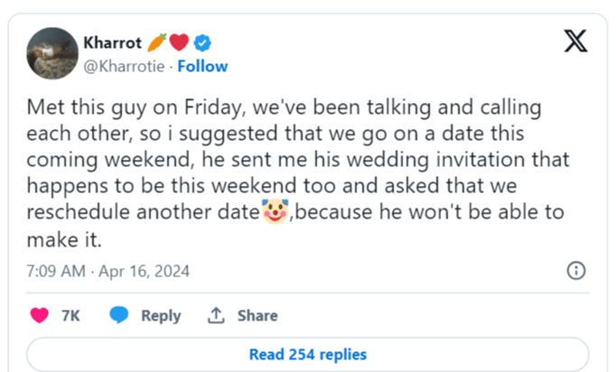 However, the situation took a shocking twist when the man, instead of confirming the date, sent @Kharrotie his wedding invitation, revealing that the ceremony was scheduled for the very same weekend they were supposed to meet.