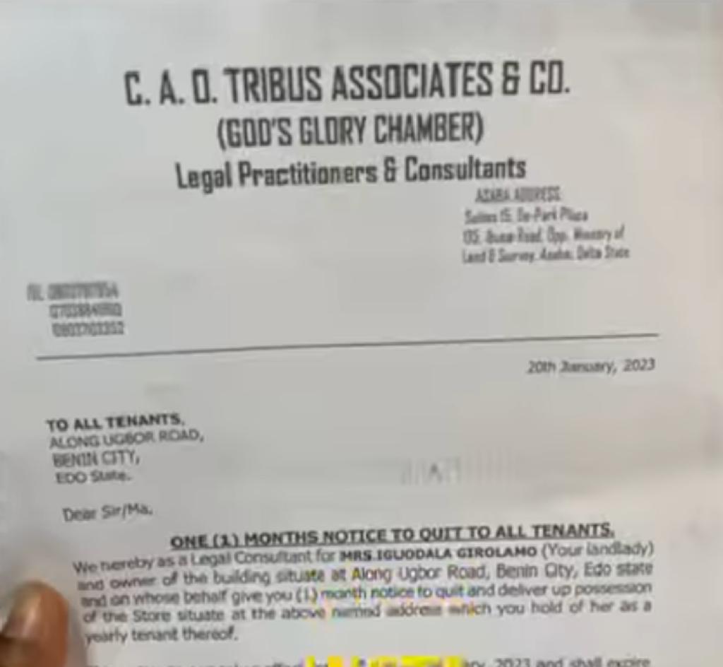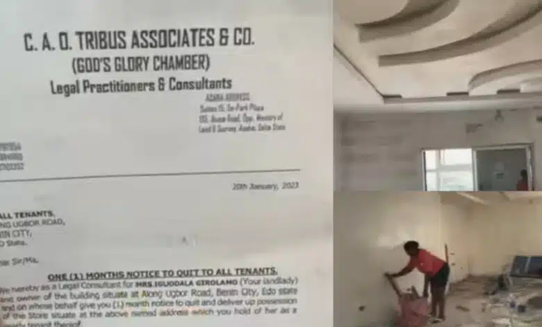 The lady’s eviction notice came after she had spent thousands of naira on the renovation of the apartment. According to the eviction letter, the incident took place in Edo state.