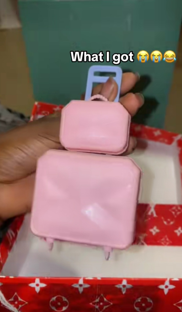 Lady breaks down in tears as she displays the travel luggage box she received after ordering it from an online store.