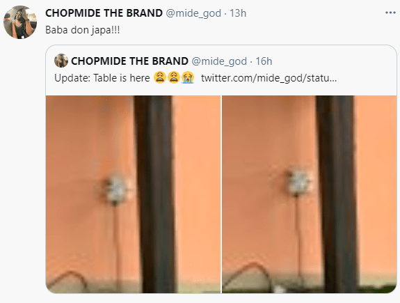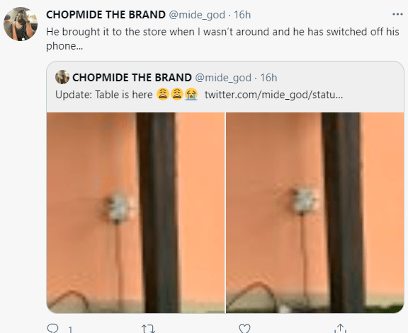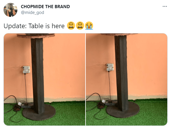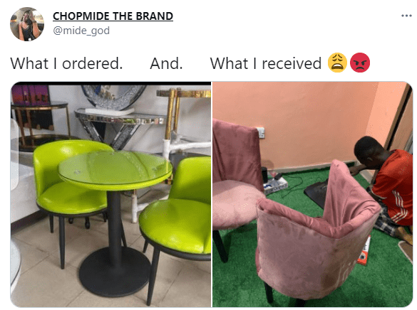The chef took to her Twitter handle, @mide_god to express how disgruntled she is over the furniture that was delivered to her.