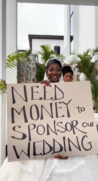 The video began with Meyiwa and her partner emerging from a building and entering a luxurious vehicle. She was dressed in a wedding gown and carrying a cardboard box. The cardboard read: “We need money to sponsor our wedding.”