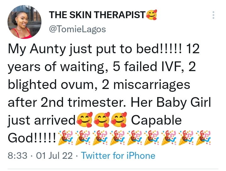 “My Aunty just put to bed!!!!! 12 years of waiting, 5 failed IVF, 2 blighted ovum, 2 miscarriages after 2nd trimester. Her Baby Girl just arrived Capable God!!!!!”