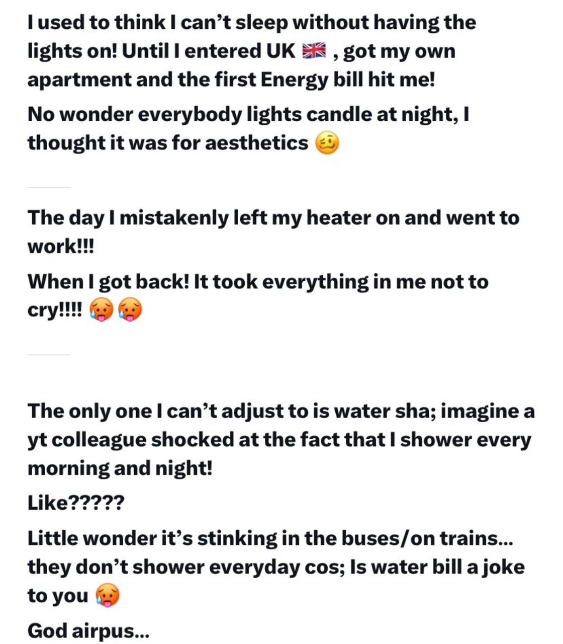 A UK-based Nigerian lady laments on Twitter about the alarming amount of money spent on electricity in the UK.