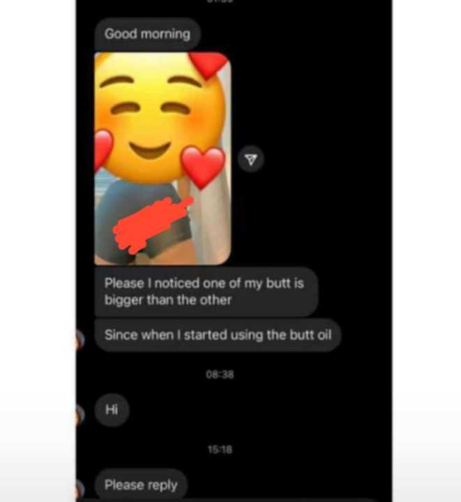 In the chat making the rounds online, the client complained bitterly about the shape of her but. ever since she purchased the products and began using it on her body.