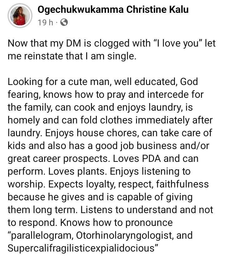 Looking for a cute man, well educated, God fearing, knows how to pray and intercede for the family, can cook and enjoys laundry, is homely and can fold clothes immediately after laundry. Enjoys house chores, can take care of kids and also has a good job business and/or great career prospects. Loves PDA and can perform. Loves plants. Enjoys listening to worship. Expects loyalty, respect, faithfulness because he gives and is capable of giving them long term. Listens to understand and not to respond. Knows how to pronounce “parallelogram, Otorhinolaryngologist, and Supercalifragilisticexpialidocious””