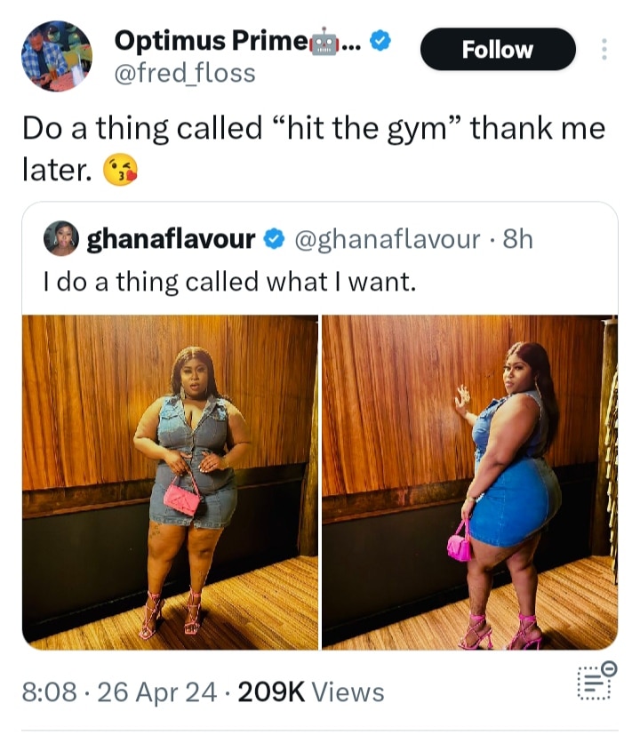 However, one netizen, a Nigerian man known as @fred_floss commented that she should try hitting the gym too.