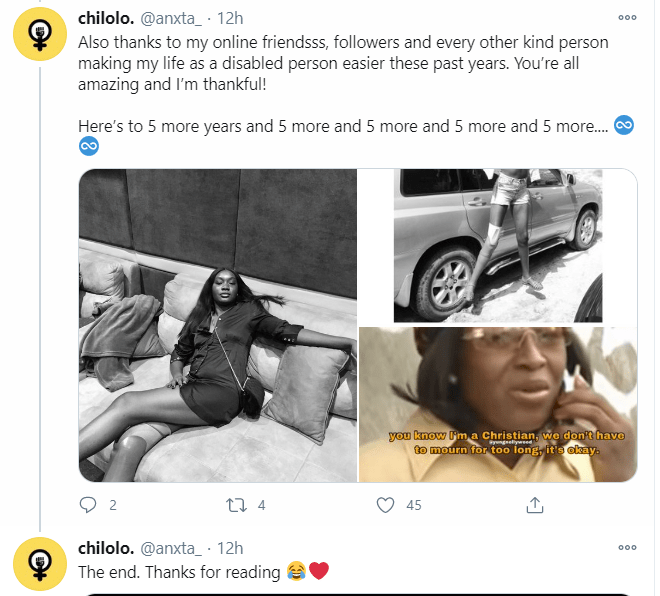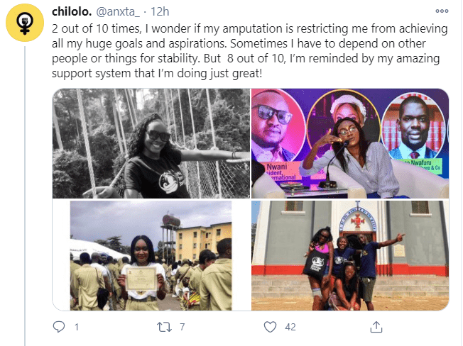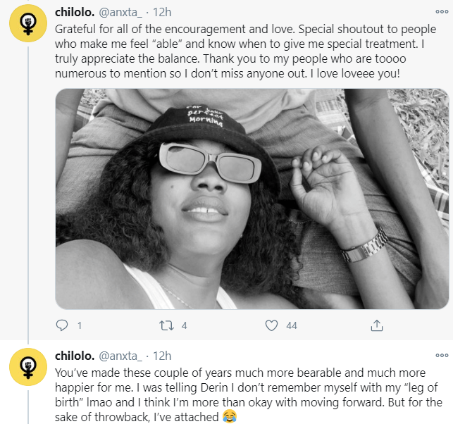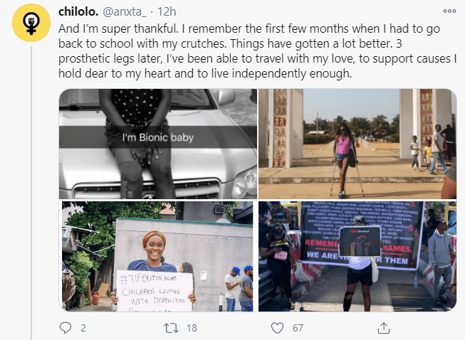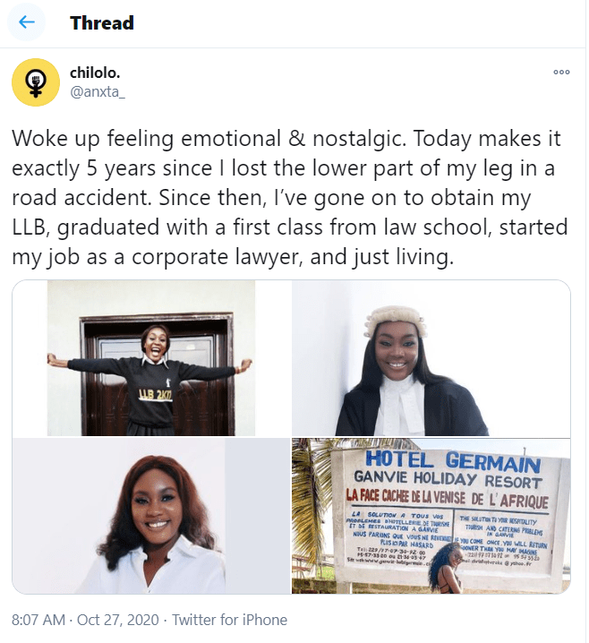A Nigerian lawyer, Chilolo, who had one of her legs amputated after suffering an accident five years ago, has listed what she was able to achieve since the tragic accident.