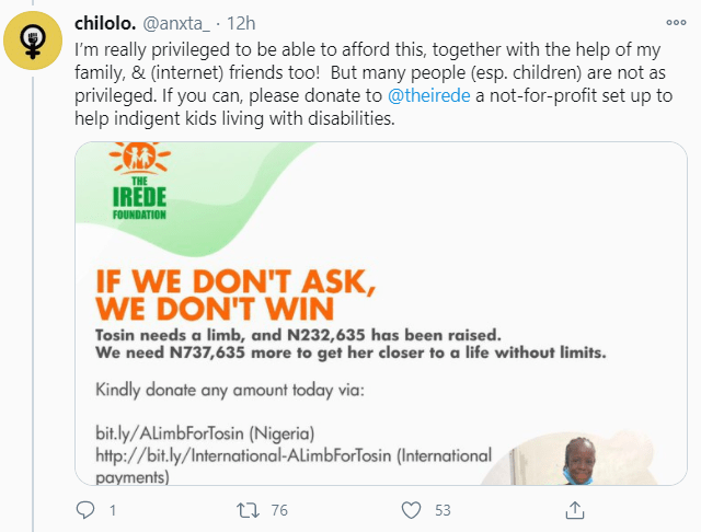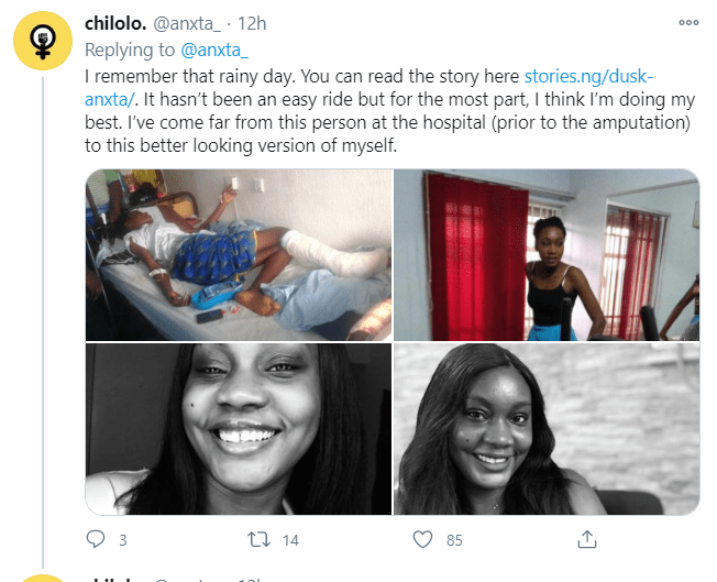 Taking to her Twitter account, she revealed she was involved in a road accident exactly five years ago. The accident resulted in one of her legs being amputated.