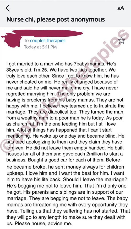Lady married to man with seven baby mamas cries out over spiritual attacks