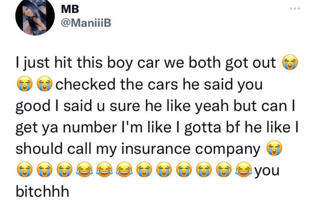 “I just hit this boy car we both got out checked the cars he said you good I said u sure he like yeah but can I get ya number I’m like I gotta bf he like I should call my insurance company -y!, bitchhh ”