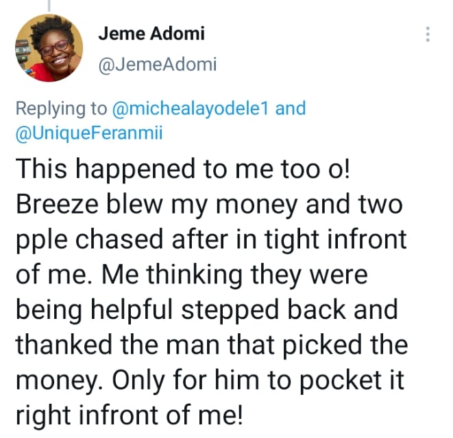 A lady identified as Jeme Adomi has shared her experience after breeze blew off her money from her hands.