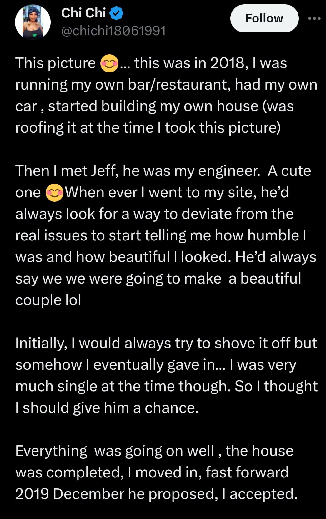 “Then I met Jeff; he was my engineer. A cute one Whenever I went to my site, he’d always look for a way to deviate from the real issues to start telling me how humble I was and how beautiful I looked. He’d always say we were going to make a beautiful couple lol.”
