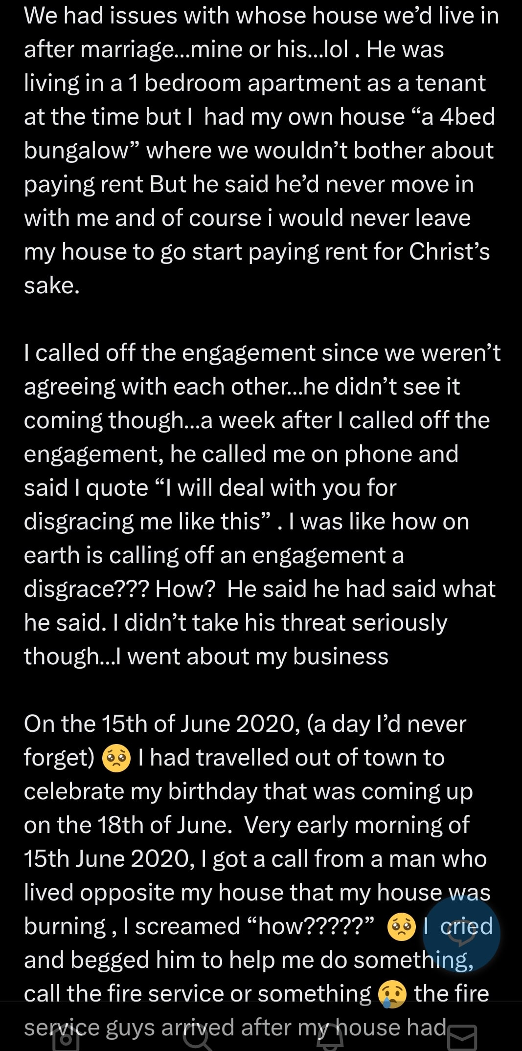 “I screamed, ‘how?????’ I cried and begged him to help me do something, call the fire service or something the fire service guys arrived after my house had completely burnt down.”
