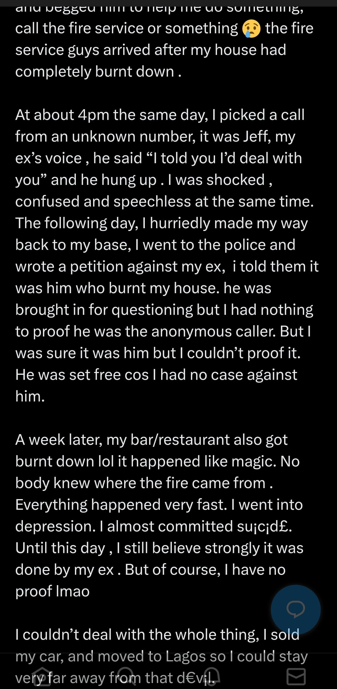 “A week later, my bar/restaurant also got burnt down lol it happened like magic. Nobody knew where the fire came from. Everything happened very fast. I went into depression. I almost committed suicide.”
