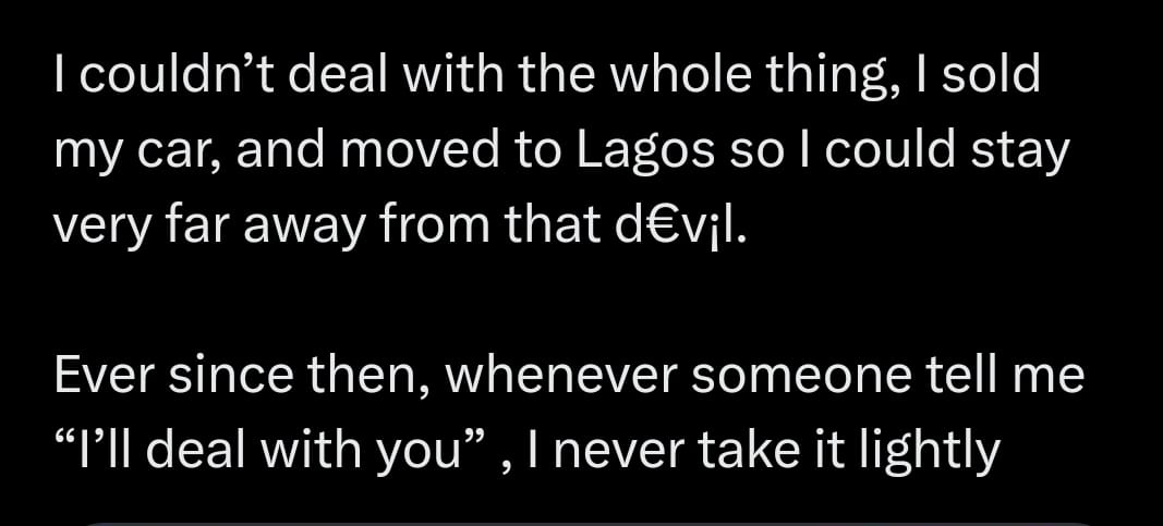 “I couldn’t deal with the whole thing, I sold my car, and moved to Lagos so I could stay very far away from that devil.”