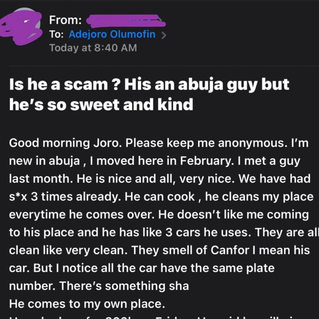 Joro Olomofin has shared a story of an anonymous lady who recounted her experience with an Abuja guy whom she met last month.