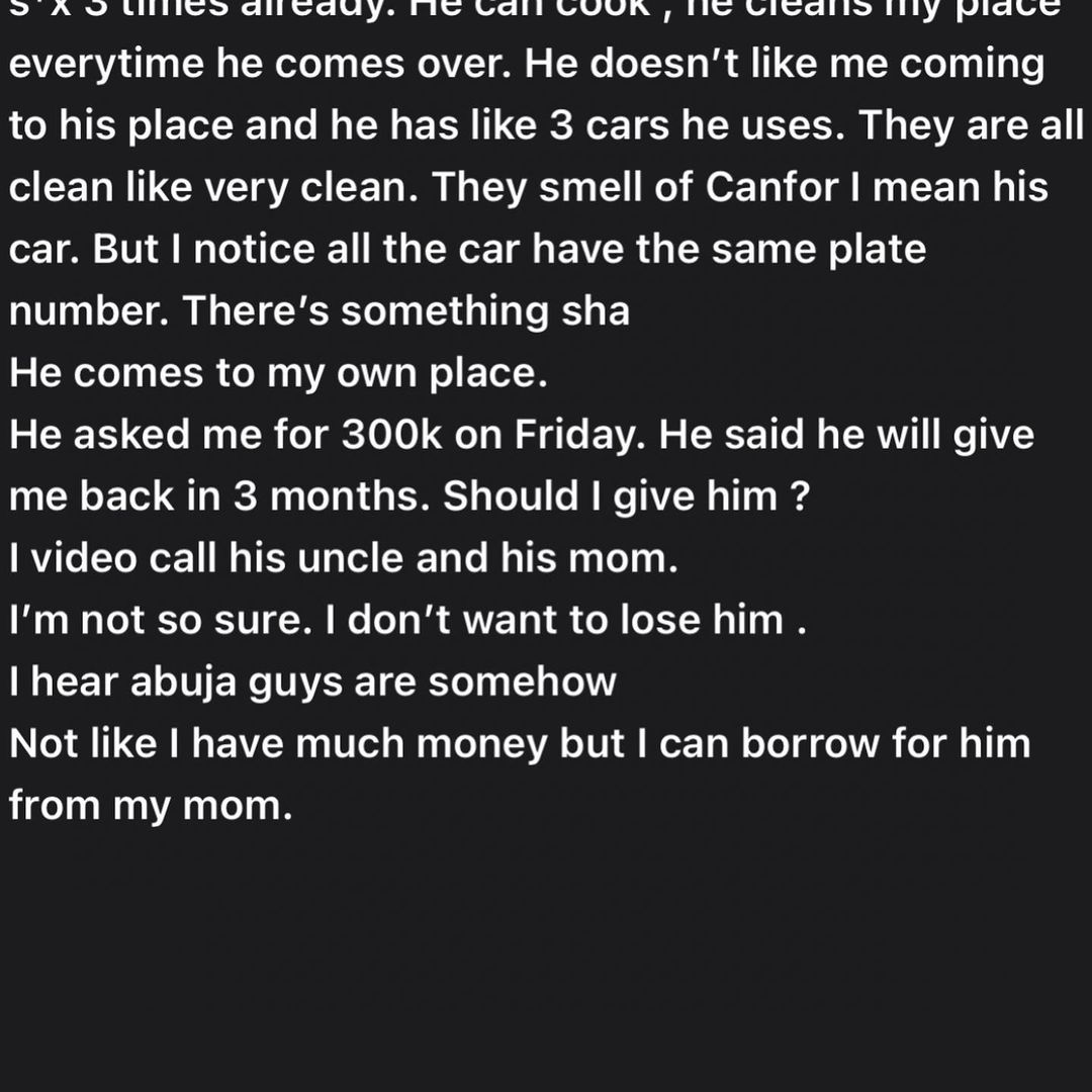 He can cook. He cleans my place each time he comes over. He doesn’t like me coming to his place and he has like three cars he uses. They smell of canfor. I mean his car. But I notice all the car have the same plate number. There’s something Sha.”