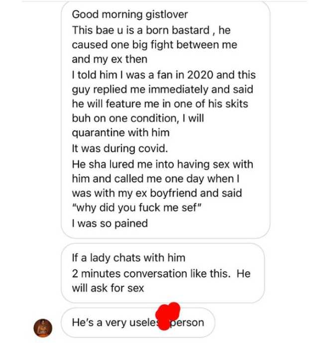 According to the lady who shared her story to Gistlovers, she sent a DM to Bae U, telling him she’s a fan, and he allegedly ended up sleeping with her.