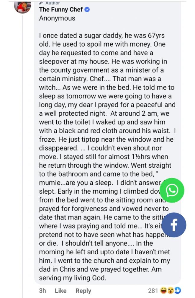 “I once dated a sugar daddy. He was 67 years old. He used to spoil me with money. One day he requested to come and have a sleepover at my house. That man was a witch.