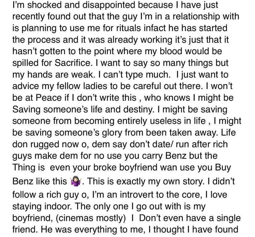 Young lady narrates the shocking experience of how her boyfriend of 3 years attempted to use her for a money ritual.