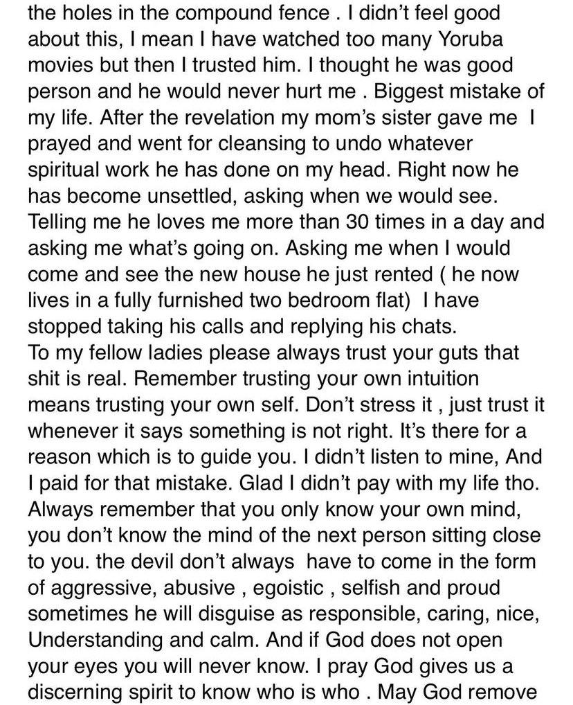The lady who did not believe tasked her sister to make an inquiry on her behalf from her church; lo and behold, the sister returned with the same message on how the guy has plans in motion to use her for money ritual.
