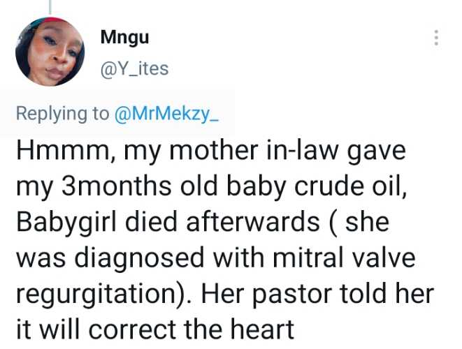 “Hmmm, my mother in-law gave my 3months old baby crude oil, Babygirl died afterwards ( she was diagnosed with mitral valve regurgitation). Her pastor told her it will correct the heart.