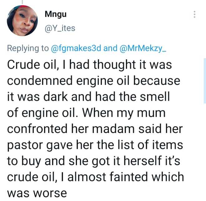 Crude oil, I had thought it was condemned engine oil because it was dark and had the smell of engine oil. When my mum confronted her madam said her pastor gave her the list of items to buy and she got it herself it’s crude oil, I almost fainted which was worse.