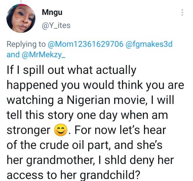 If I spill out what actually happened you would think you are watching a Nigerian movie, I will tell this story one day when am stronger ?. For now let’s hear of the crude oil part, and she’s her grandmother, I shld deny her access to her grandchild?”