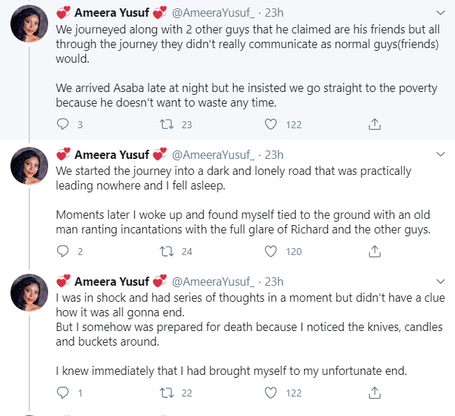 Ameer said Richard told her he was into real estate and she believed him. She then went further to narrate how he asked her to follow him to Delta state to access a property, but on reaching there, it was a different story.