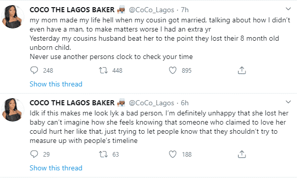 @Coco_Lagos said her mother made her life hell when her cousin got married before her. She added that her cousin has now lost her unborn baby at 8 months of pregnancy after her husband beat her up.