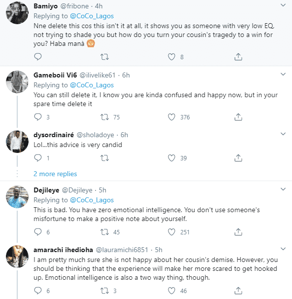 A baker took to Twitter to pass a message across with her cousin’s misfortune. However, Twitter users felt her message was insensitive.