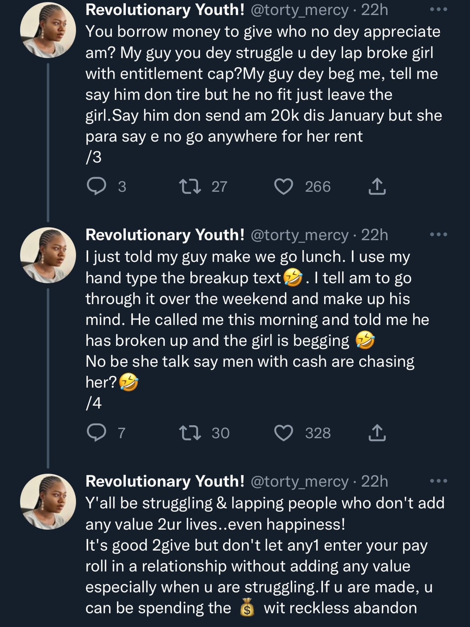 You borrow money to give who no dey appreciate N._ , am? My guy you dey struggle u dey lap broke girl with entitlement cap?My guy dey beg me, tell me say him don tire but he no fit just leave the girl.Say him don send am 20k dis January but she para say e no go anywhere for her rent.