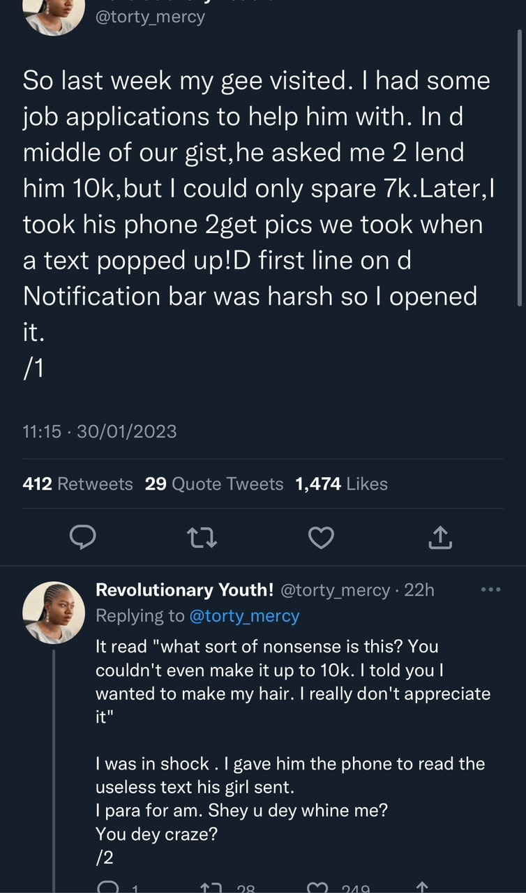 “So last week my gee visited. I had some job applications to help him with. In d middle of our gist,he asked me 2 lend him 10k,but I could only spare 7k. Later,l took his phone 2get pics we took when a text popped up!D first line on d Notification bar was harsh so I opened it.