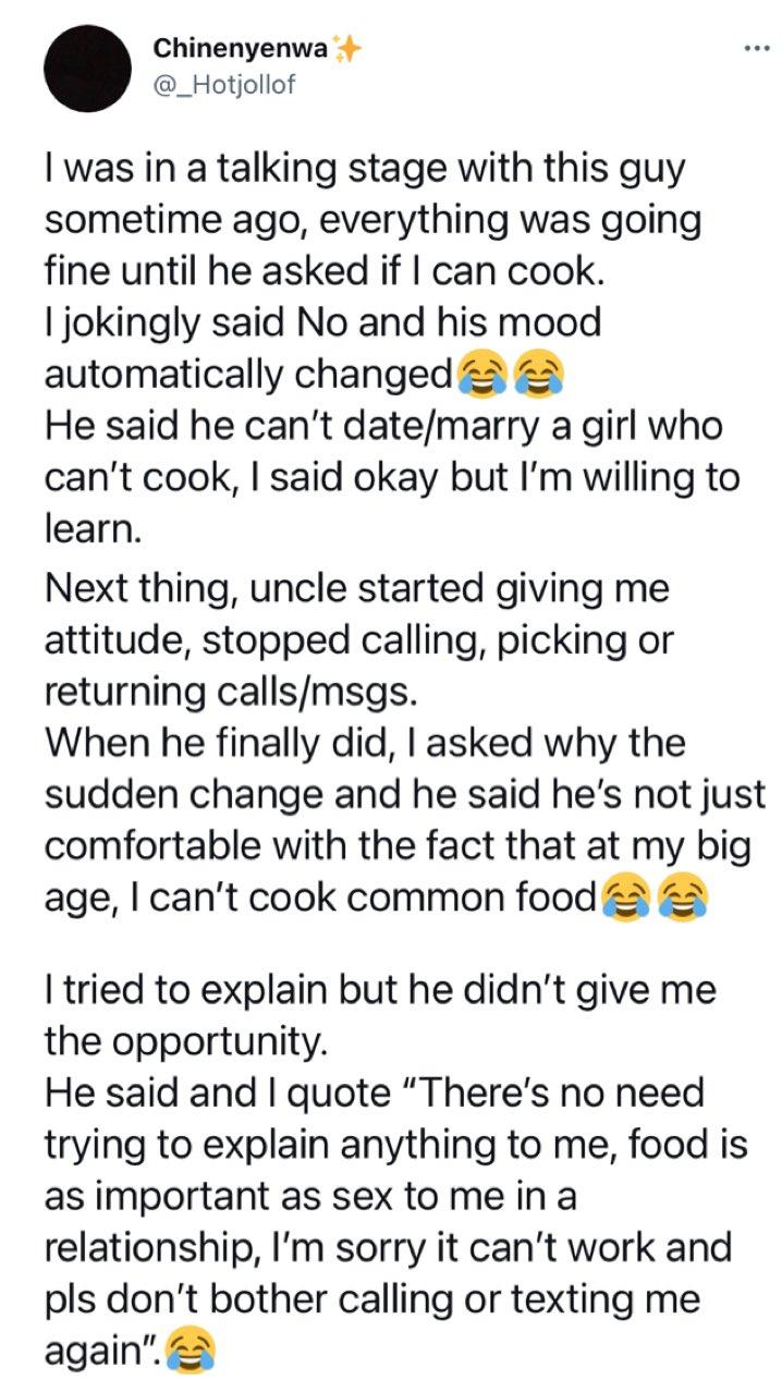 Twitter user identified by her handle as @_Hotjollof narrates how her relationship with a man ended after she jokingly told him that she can’t cook.
