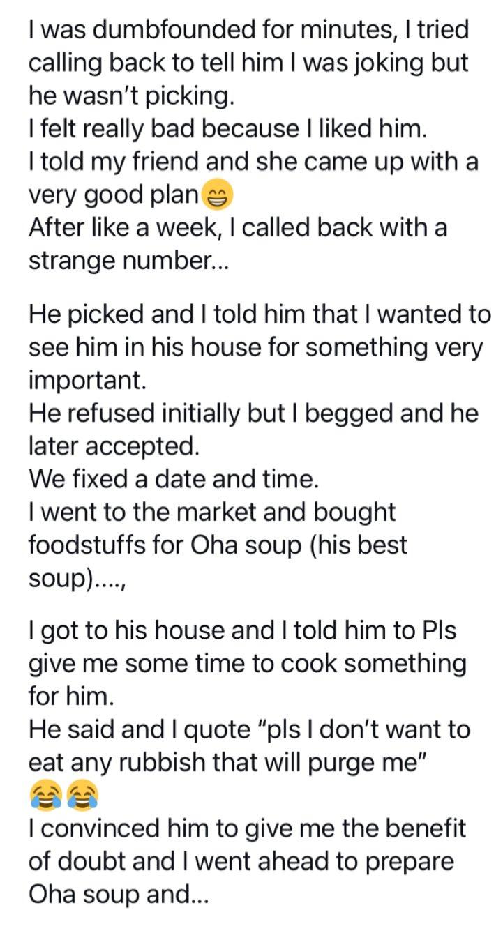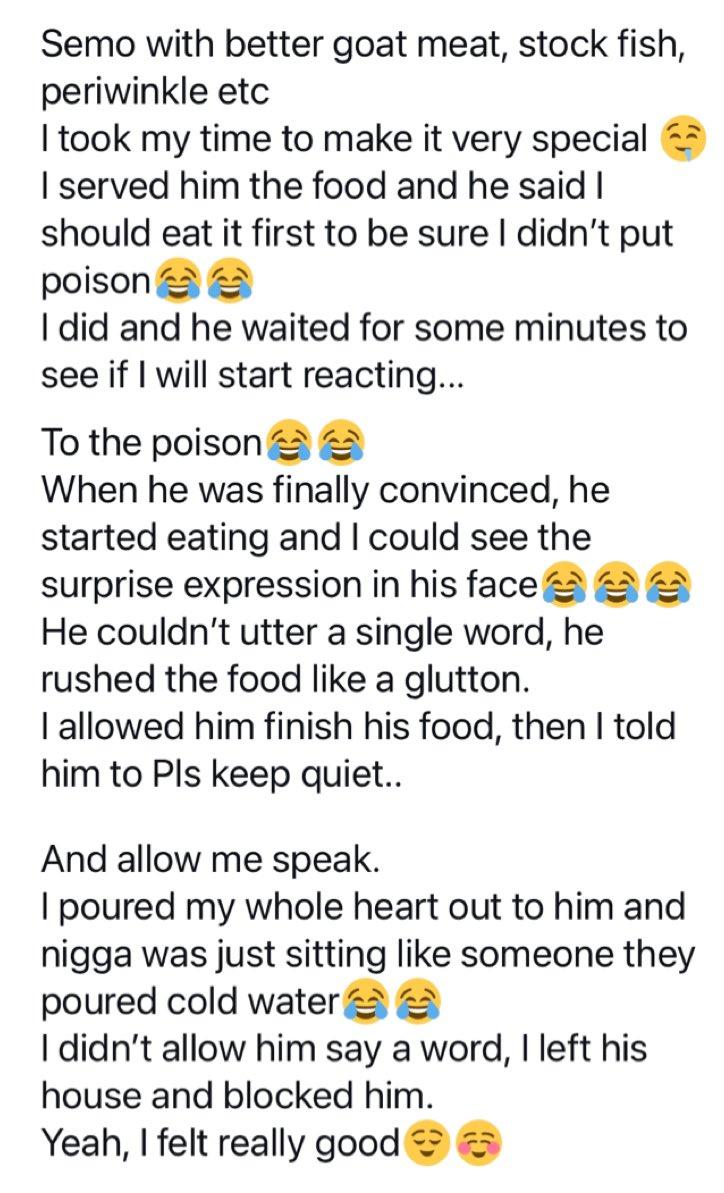 He said and I quote “There’s no need trying to explain anything to me, food is as important as sex to me in a relationship, I’m sorry it can’t work and pls don’t bother calling or texting me again”.