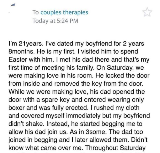 While we were making love, his dad opened the door with a spare key and entered wearing only boxer and fully er**cted. I rushed my cloth and covered myself immediately but my boyfriend didn’t shake. Instead he started begging me to allow his dad join us”.