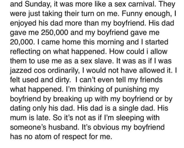 According to her, she was making love to her boyfriend when his father came into the room, and she ended up having s*x with them for N270,000.