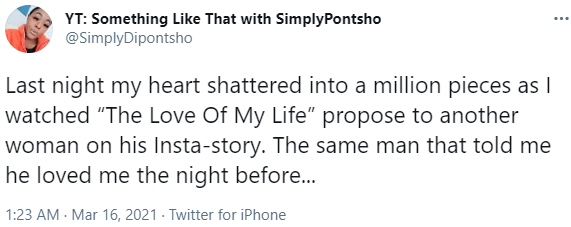 ”Last night my heart shattered into a million pieces as I watched “The Love Of My Life” propose to another woman on his Insta-story. The same man that told me he loved me the night before.